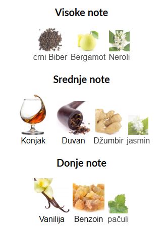 - Gornje note: Crni biber, Bergamot, Neroli