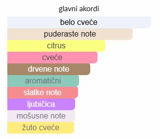 - Srednje note: Jasmin, Cvet narandže, Mimoza, Heliotrop, Ljubičica, Ruža, Breskva