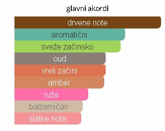 - Bazne note: Agar (oud), kardamon, gurjan balsam, olibanum, labdanum, španski labdanum, amyris, drvo guaiac, kleka, pačuli, kedar, kumin i cypriol oil (nagarmotha) – stvaraju duboku, začinsku i bogatu osnovu.