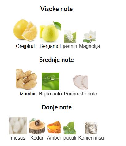 - Gornje note: Grejpfrut, Bergamot, Jasmin, Magnolija