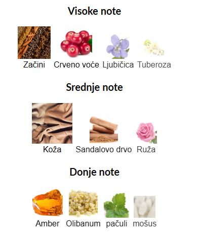 - Gornje note: Začini, Crveno voće, Ljubičica, Tuberoza