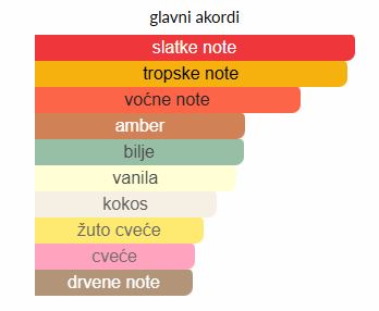- Srednje note: Kokos, Ylang-Ylang, Amber, Smokva