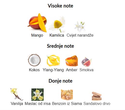 - Gornje note: Mango, Kamilica, Cvet narandže