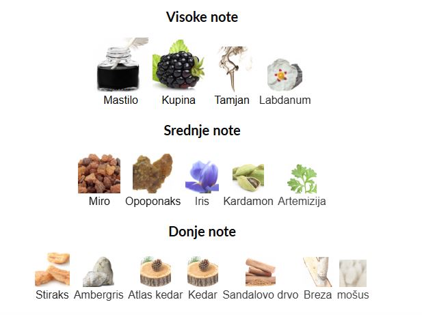 - Gornje note: Mastilo, Kupina, Tamjan, Labdanum