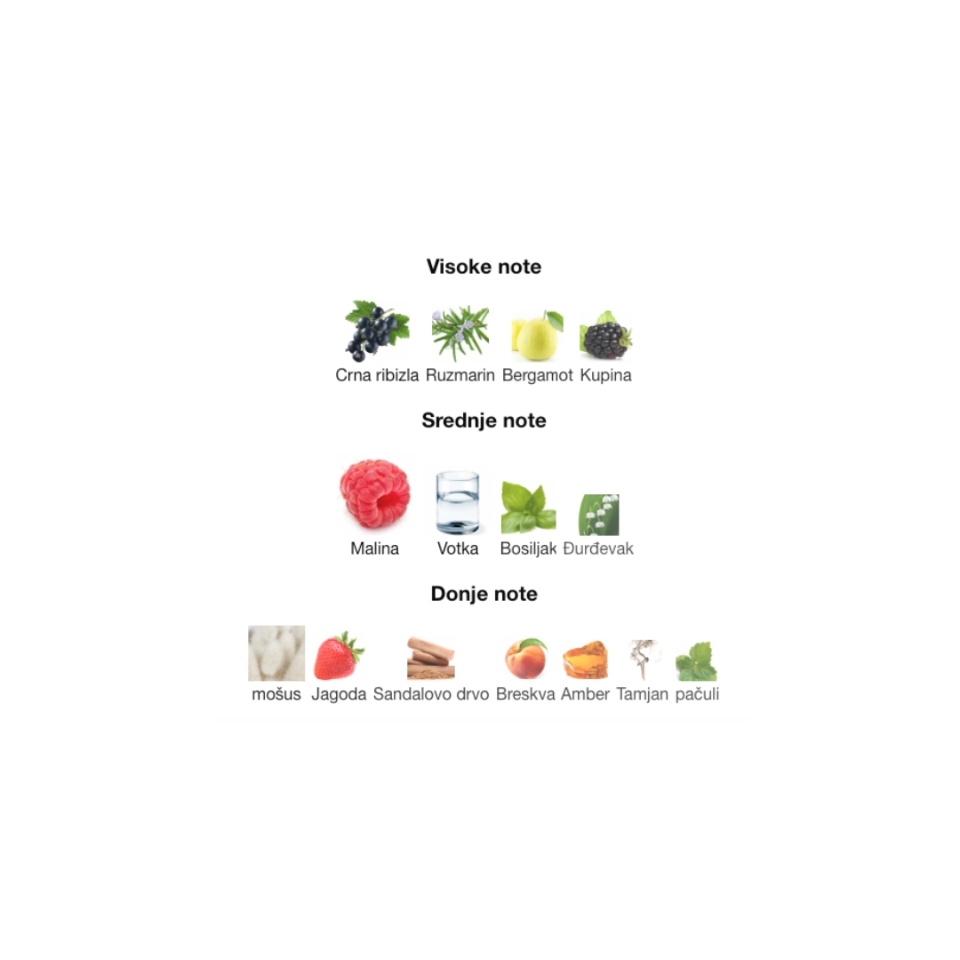 Otvor parfema donosi svetle citrusne note, kao što je bergamot, koji parfemu daje svežinu i energiju. U srcu se razvija bogatstvo ružinih latica i jasmina, koji donose floralnu i kremastu dimenziju, dok baza sadrži vanilu i mošus, što parfemu daje toplinu i senzualnost.