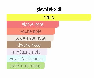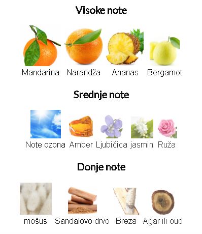 Citrusne note leže na bazi slatkog voća, poput ananasa, i ljupkog, slatko mirisnog cveća, poput jasmina, ljubičice i ruže, snažno odjekujući jedinstvenom snagom ambera.