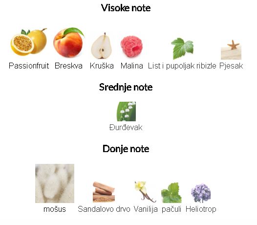 Gornje note: Passionfruit, Breskva, Kruška, Malina, List i pupoljak ribizle, Pjesak