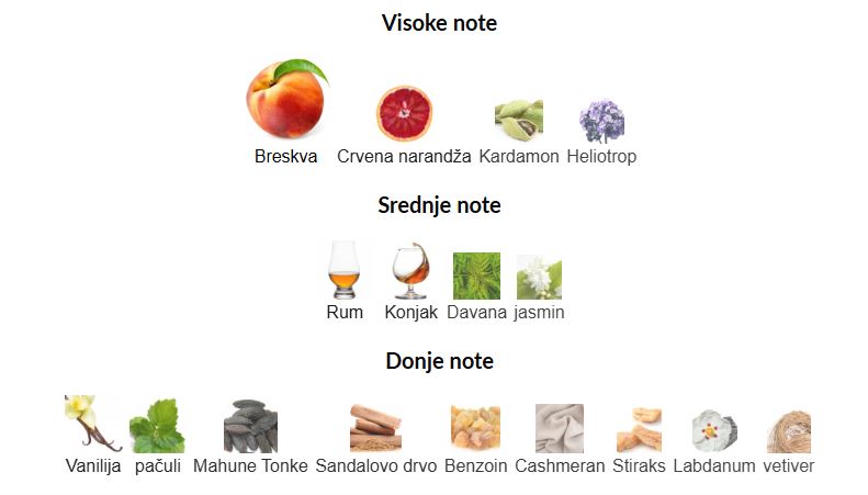 - Srednje note: Rum, Konjak, Davana, Jasmin