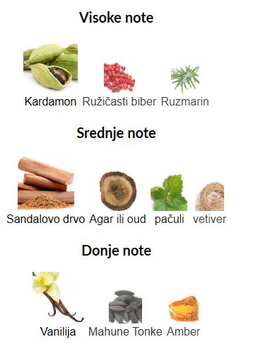- Srednje note: Sandalovina, Oud (agar), Pačuli, Vetiver