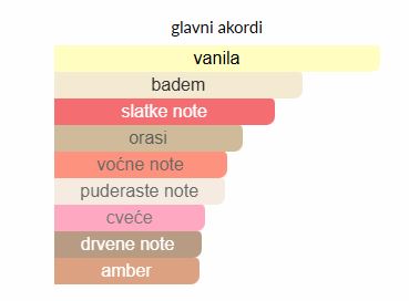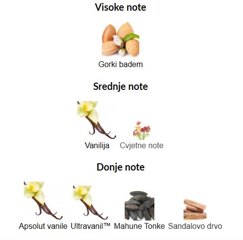 - Bazne note: Apsolut vanile, Ultravanil™, Mahune Tonke, Sandalovo drvo