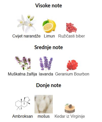 - Gornje note: Limun, cvijet naranče, ružičasti papar s Madagaskara