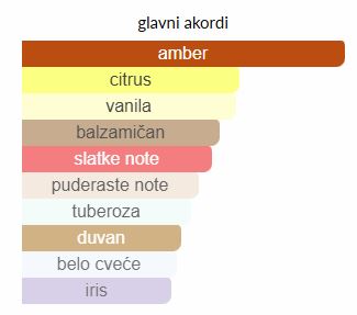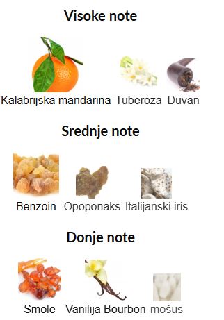- Gornje note: Kalabrijska mandarina, Tuberoza, Duvan