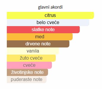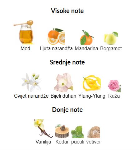 - Gornje note: Med, Gorka narandža, Mandarina, Bergamot
