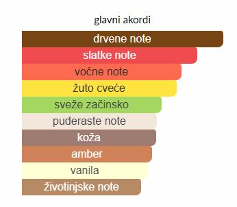 - Donje note: Vanilija, Pačuli, Mošus, Kedar iz Virdžinije, Haiti vetiver