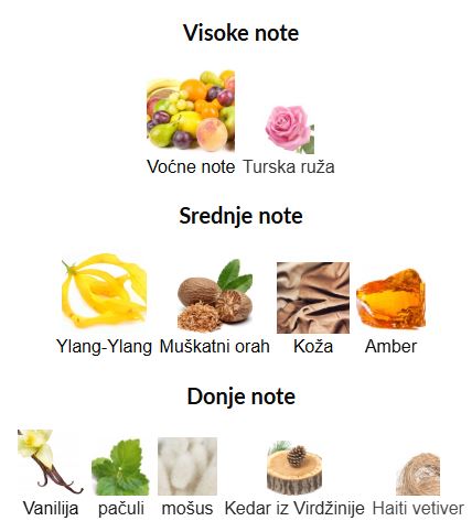 - Srednje note: Ylang-Ylang, Muškatni orah, Koža, Amber