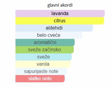 - Gornje note: Aldehidi, Bergamot, Mandarina
